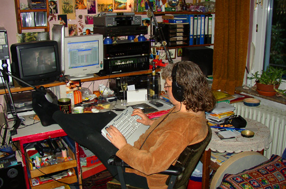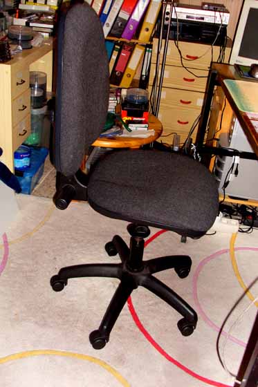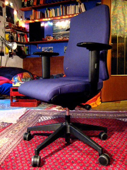 Z.B. hatten wir Jahrzehntelang, kann man sagen, einen wunderbar bequemen (und natürlich sauteuren) Bürostuhl aus dem Architekturbüro von Barbaras Vater (der dort auch schon etliche Jahre auf dem Buckel hatte und dort sogar mal neu bezogen wurde). Ein Stuhl von einer einfachen, eleganten, bequemen und soliden Machart, wie man sie leider schon seit vielen Jahren nirgends mehr erhält (man kriegt nur noch diese unförmigen Scheusale). Jedoch war bei dem schönen Teil die Gasdruckfeder mittlerweile kaputt. Wir besorgten uns irgendwelche Schellen, die wir um die fuck-Gasdruckfeder bastelten, damit die Höhe konstant blieb. Und so funktionierte das wunderbare Ding einwandfrei, bis es allmählich immer mehr zerfledderte - und dann doch noch leider irgendwann (2008) was gebrochen war, sodaß man bzw. frau auf dem Ding obendrauf rumschaukelte. Schweren Herzens haben wir uns dann von dem guten Teil endgültig getrennt. (Nun besitzt Barbara stattdessen einen teuren, und hoffentlich stabilen, High-Tech-Bürostuhl mit allen Schikanen.).