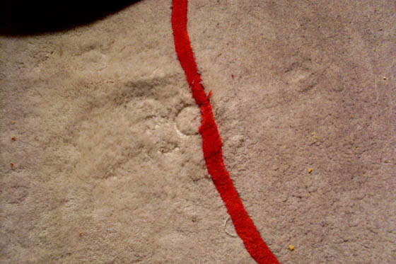 Man erkennt hier die Druckstellen, die das Mittelteil auf dem Teppich hinterlassen hat. Glücklicherweise hat er es noch halbwegs überlebt: