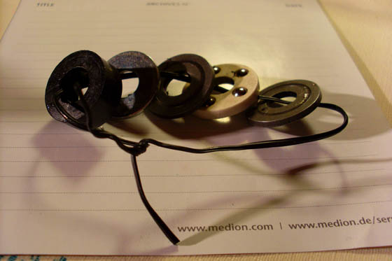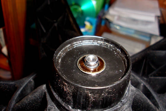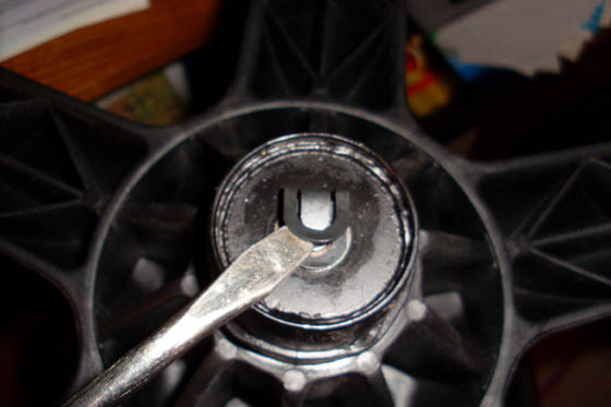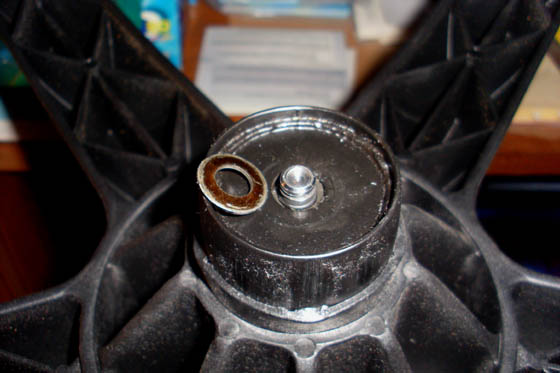 Nach dem Ablösen der Stahlklammer kann man das Fußkreuz mit seinem mittleren Hohlraum ganz leicht von der Gasdruckfeder abziehen. Doch jetzt gilt es aufzupassen: Innendrin befindet sich ein kleines Kugellager und einiges Sonstige Drumherum. Erstens können diese Dinger lose da drin in dem Hohlraum sein und man sollte a) achtpassen, daß nix verloren geht oder (wegen Schmier-Fett) drin bleibt und b) in welcher Reihenfolge die Dinger da ankommen. Zweitens kann es auch sein, daß diese Dinger fest an der Stange der Gasdruckfeder angebracht sind, dann besteht allerdings kein Problem, was man natürlich vorher nicht weiß.