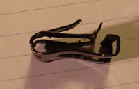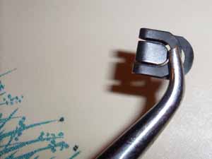 Die Klammer ist (prinzipiell) so konstruiert, daß sie an einer Seite (hier die Vorderseite) unten eine breite Öffnung hat, die auf das Ende der Gasdruckfeder in eine Rille geschoben wird. Desweiteren dient der obere Aufbau dazu, die Klammer anzudrücken, daß sie sich nicht mehr von selbst lösen kann. Deshalb muß man das obere Teil erst mal lockern, wenn man das Fußkreuz abmontieren will. (Wird alles noch genauer gezeigt.)