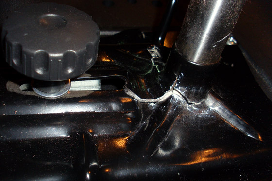 Bei ihm war die ganze (schwarzlackierte) Platte unter dem Sitz eingebrochen. Es hatte einige Zeit gedauert, bis ich dahinter kam, warum ich auf dem Stuhl nicht mehr richtig sitzen konnte, sondern stattdessen unbequem rumschaukelte. Schließlich entdeckte ich das Problem: