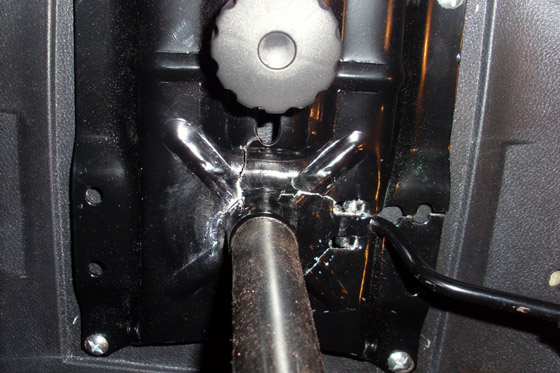Hier sieht man deutlich die Rille am Ende der Gasdruckfeder, in welche die Klammer reingeschoben ist, um den Fuß am Stuhl zu halten. Unterhalb der Rille ist noch eine Unterlegscheibe: