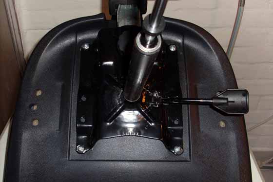 Zunächst muß der Stuhl umgedreht werden, so daß das Fußkreuz nach oben kommt. Wie man sieht, befindet sich eine Art Stahl-Klammer in der Mitte des Fußkreuzes am Ende der Gasdruckfeder. Sie arrettiert das Fußkreuz am Rest des Stuhles.