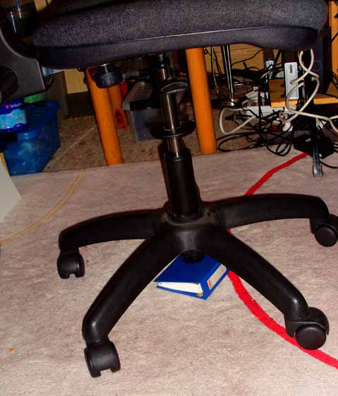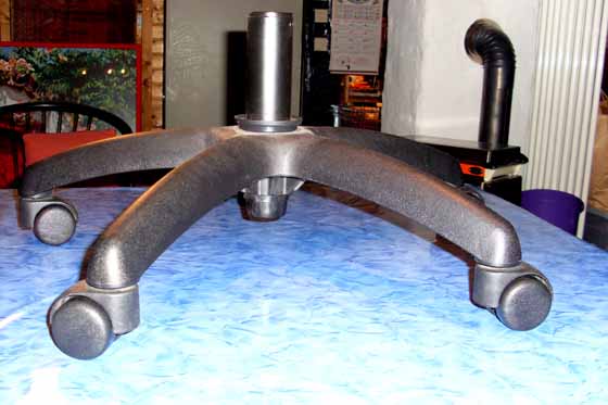 Wie man sieht, schwebt das Fußkreuz über dem Mittelteil. D.h. das Fußkreuz hat sich immer weiter am senkrechten Mittelteil (in dem normalerweise die Gasdruckfeder ist) hochgeschoben. Man konnte das Fußkreuz auch nicht mit einem Gummihammer nach unten zurückklobben - oder nur sehr schwer. Im Übrigen hätte es auf die Dauer eh nix genutzt. Das Fußkreuz als solches kann man nicht mehr gebrauchen! Vielleicht noch die Rollen, falls sie sich losschrauben lassen. Der Konstrukteur, der sich so eine Lösung hat einfallen lassen (daß das Mittelteil nicht bombenfest mit dem Fußkreuz verankert ist) gehört gedroschen! - So, und jetzt den an und für sich immer noch sehr gut erhaltenen Bürostuhl wegwerfen und einen neuen kaufen? - Diesen Gedanken erwog ich ernsthaft - und wollte schon in einer Bürostuhlfabrik einen neuen für 100 € bestellen. Doch da kam mir eine Idee. Ich hatte doch das kaputtene Sauding im Keller rumstehen. Vielleicht könnte ich dessen Fußkreuz noch benutzen? - Gesagt - Getan. - Und tatsächlich es klappte auf Anhieb!