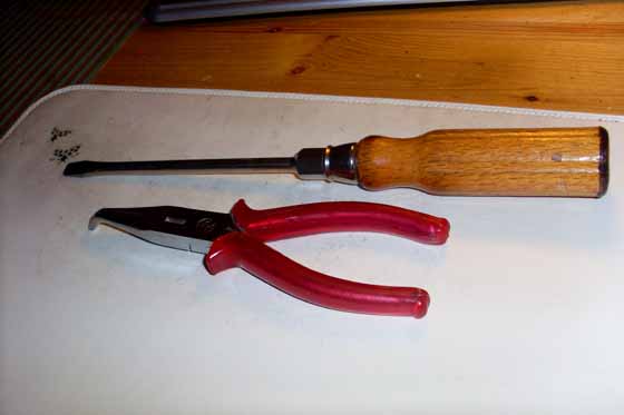 Hier versuche ich also die Klammer (die übrigens nicht identisch mit der auf dem kleinen Bild ist, sie stammt von dem anderen, dem organspendenden Stuhl) mit einem Schraubenzieher zu lösen, indem ich das Stahlblech mit dem Schraubenzieher hochbiege. Allerdings handelt es sich dabei um einen Flohzirkus - in einem hohen Bogen springt die Klammer irgendwo hin. Vielleicht sollte man gleichzeitig eine Hand über die Klammer halten, denn die Sucherei nach dem kleinen Ding kann stressig sein..