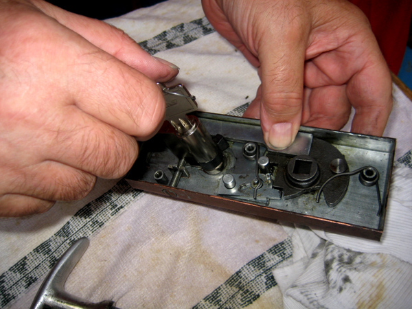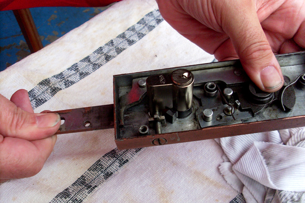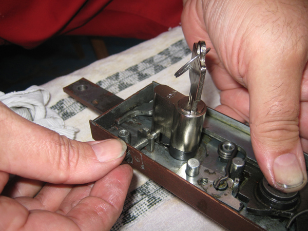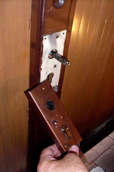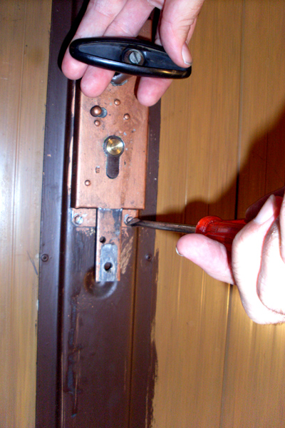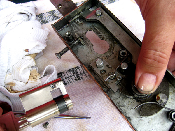 Ich hatte an dem Nachmittag eigentlich wenig Zeit, weil wir nachher Besuch hatten. Also zog ich geschwind meine Arbeitsklamotten an, holte mir noch ein eiskaltes Coca-Cola aus dem Kühlschrank und los gings. Barbara hatte schon einige Stellen gefunden am Schloß, wo man Schrauben sah. Dieselben gingen erstaunlich leicht loszuschrauben. - Kurz und furz: an jenem Donnerstag wurde ich natürlich noch nicht fertig, weil ich am Ende vor einem Chaos von Einzelteilen des Schlosses saß, die ich mir wie ein Puzzle irgendwie wieder zusammenpfriemeln mußte. Barbara konnte glücklicherweise noch einen Ersatzschließzylinder (ein ziemlich spezielles Teil) bei einem Schlüsseldienst besorgen (für 12 € nochwas), sodaß wir dieses Problem schon mal los waren. (Offenbar waren im alten Zylinder irgendwelche Stifte gebrochen - was immer uns das sagen will). Am nächsten Tag, als ich mir wieder den Kopf zerbrach über den Flohzirkus des Schloß-Inneren, war ich schon fast soweit zu kapitulieren, als ich zusammen mit Barbara endlich die Lösung fand. - Daraus folgt der Merksatz:
