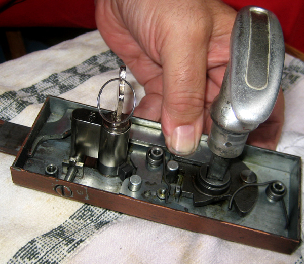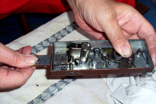 Und jetzt liegt das Schloß-Innere mit seiner ganzen Pracht vor uns! Wichtig ist es aber, daß man dieses Schloß nun wie ein rohes Ei behandelt. Am besten man ist jetzt zu zweit. Bei allen weiteren Tätigkeiten am Schloß, solange das Blech noch abgeschraubt ist, sollte man unbedingt mit dem Daumen die eigenartig gezackte schwarze Metall-Scheibe mit dem Vierkantloch fest andrücken, wenn man nicht zusätzliche Fummeleien auf sich nehmen will, um alles wieder so hinzukriegen wie es war.
