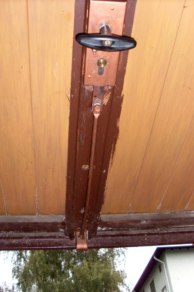 Hier unten ist der Griff schräg (45° nach rechts gedreht) und die Greifer der Schließkrake sind eingefahren. (D.h. der Riegel samt Schließkrake ist nach oben gezogen). Man stellt also den Griff schräg, drückt das Garagentor nach unten, sieht zu, daß es ganz an den Einraster rangedrückt ist, dann stellt man den Griff waagrecht: Die Greifer sollten dann in dem Einraster sein. Jetzt muß man nur noch den Schlüssel nach links drehen, um das Garagentor abzuschließen.