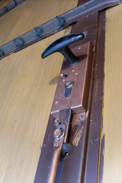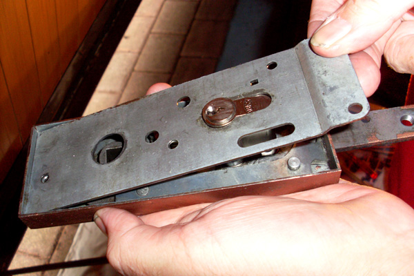 Hier sieht man also die Tür von innen - und dementsprechend das Schloß mit seiner nach unten gehenden langen Schließkrake.