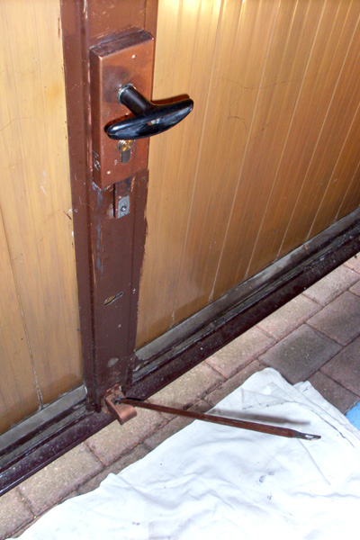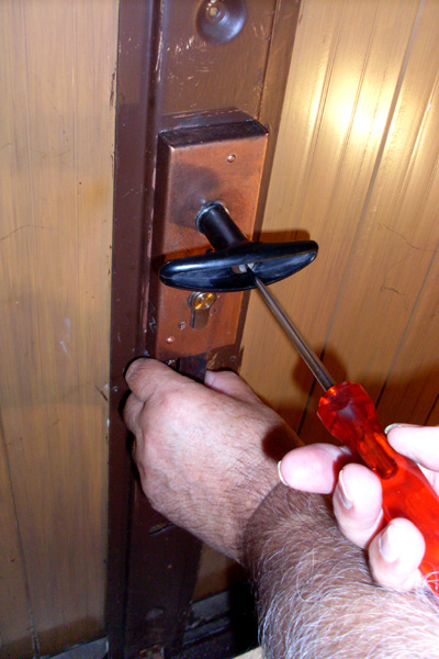 Wenn man die Schraube am Griff löst, sollte man vorsichtshalber das Schloß an dem unteren Riegel festhalten, damit es nicht runterfällt.