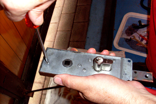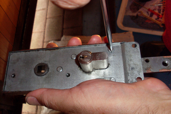 Man sieht ganz unten links über meinem Zeigefinger die Schraube, die den Schließ-Zylinder im Schloß festhält. Diese Schraube sollte man jetzt noch nicht losschrauben.