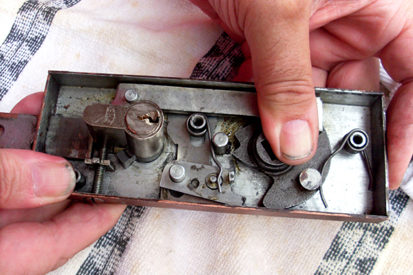 Man hebe jetzt vorsichtig das Blech ab - und zwar so, daß einem nicht alle Innereien in einem Ruck wie ein Flohzirkus entgegenspringen. Man sollte deswegen die Schraube an der Seite, die den Schließ-Zylinder festhält, ebenfalls ein klein wenig lockern