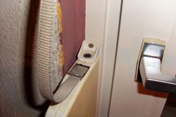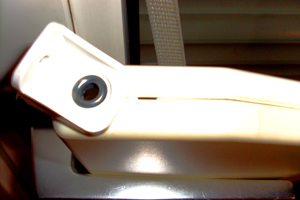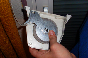 Überprüfen, ob der Gurt nach oben keine Verdrehungen hat. Jetzt muß der Aufroller mit seinem Gehäuse wieder an den Fensterrahmen angeschraubt werden - Barbara hält, ich schraube.