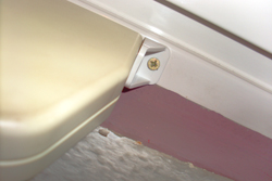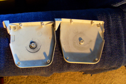 Nun erkennt man auch das Problem: der Gurt hat sich daneben gewickelt und sich im Seitenteil des Aufrollers verklemmt. Dadurch ist nun der Aufroller blockiert. Die Lösung ist einfach: erst mal Dreck weg, dann die andere Backe des Gehäuses auch noch ab und den Gurt ganz neu aufrollen ab der Stelle, wo er sich verwurschtelt hat. Plötzlich ist wieder Zug da. Deswegen jetzt zunächst mal den Aufroller am Türöffner festklemmen