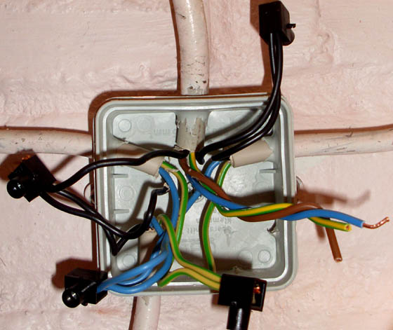 Wenn ich mir den Verteiler von innen genauer anschaue (natürlich habe ich die Sicherung vorher abgeschaltet), erkenne ich, daß der Elektriker für den Schalter ein 5er Kabel genommen hat: dabei benutzte er nur die beiden schwarzen Adern, die drei anderen (braun, blau, grün-gelb) blieben unbenutzt. Dabei ist seltsam, daß die blaue Ader vorne freigelegt (abisoliert) ist, wie wenn sie doch benutzt worden wäre.