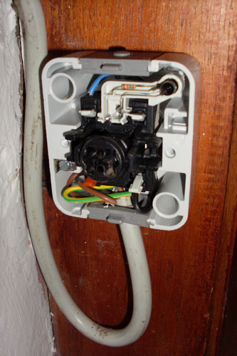 Die grün-gelbe und die braune Ader sind ohne Funktion. Wie gesagt, rein theoretisch hätte es meiner Ansicht nach auch ein einfaches normales dreiadriges Kabel getan. Jedoch haben moderne deutsche Elektriker offenbar eine Scheu vor solchen ‘primitiven’ Lösungen, weil sie vermutlich zu Recht annehmen, daß sie zu evtl. gefährlichen Irreführungen Anlaß geben können.