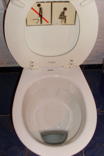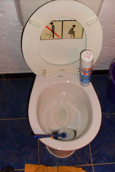 Zunächst muß das Klo in- und auswendig und rundum gründlich mit den üblichen Reinigungsmitteln behandelt werden. Anschließend den gesamten Bereich desinfizieren, beispielsweise mit Sagrotan-Spray - damit ich mich bei den weiteren Arbeiten nicht unnötig ekele. Das Klo sieht jetzt ungefähr so wie auf dem nächsten Bild aus: