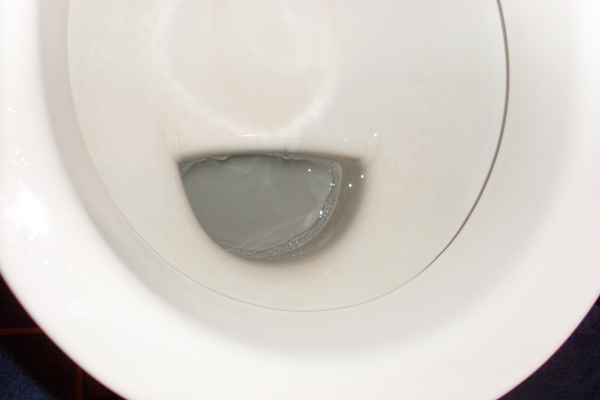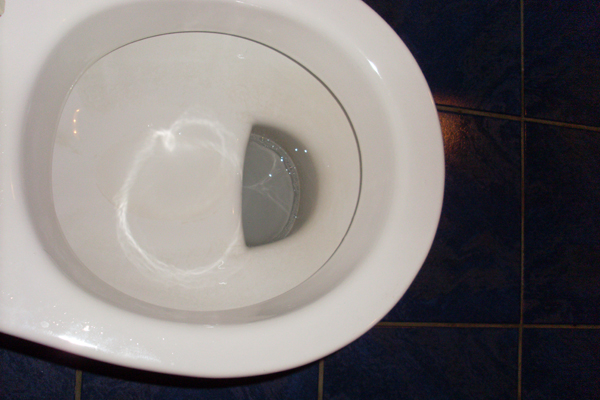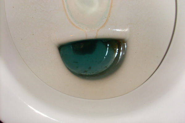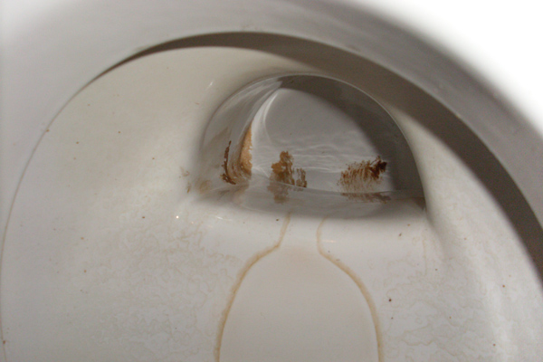 Hier sieht man ziemlich deutlich oben im Becken den hellbraunen Kalkstein-Rand und unten im Abgang gewisse Ablagerungen, die auch bei normaler Reinigung mit der Klobürste nicht weggehen. Das Bläuliche ist ein übliches Klo-Reinigungsmittel.