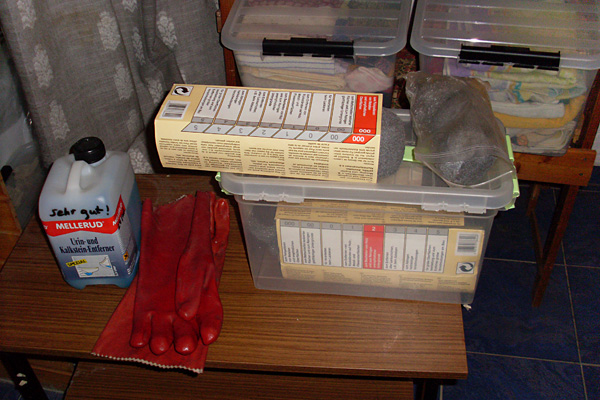 Hier sieht man schon einige entscheidende notwendige Untensilien: dicke, lange, chemie-geeignete Gummi-Handschuhe, den Wassereimer mit dem großen Schwamm - und das spezielle Säure-Reinigungsmittel.