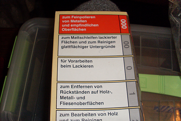 Es kommen meiner Ansicht nach alle Sorten Stahlwolle zwischen der Norm No. 000 und 2 in Frage. Der Vorsichtige sollte vielleicht nur im Nullerbereich bleiben. Ich persönlich gehe bei dieser Kloreinigung bis hin zu 2.