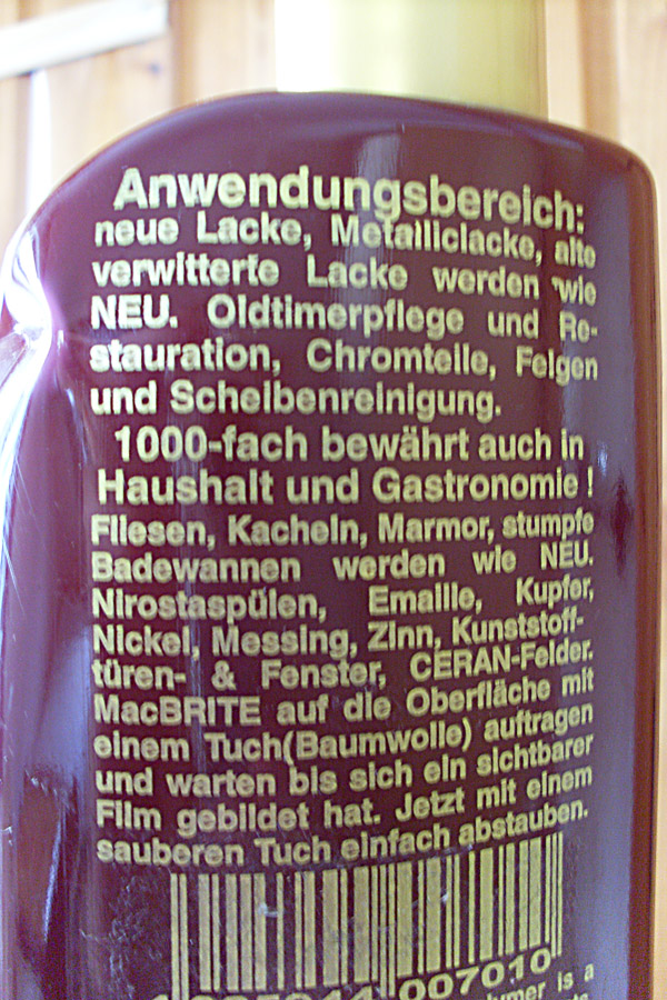 Das Zeug wird mit einem Lappen (oder Küchenpapier) überall im Inneren des Klos aufgetragen, ganz besonders aber bei den ehemaligen Ablagerungsstellen von Kalk & Kacke. (Auch Außen kann man das Zeug auftragen). Anschließend mit einem sauberen Lappen (oder Küchenpapier) etwas nachpolieren. Dadurch sollte ein langandauernder Oberflächenschutz entstehen, der die Ablagerungen weniger schnell oder auch weniger stark entstehen läßt. Man kriegt MacBRITE als Autopflege-Mittel, 1/2 Liter für z.Zt. 13 €. Einfach mal googeln.