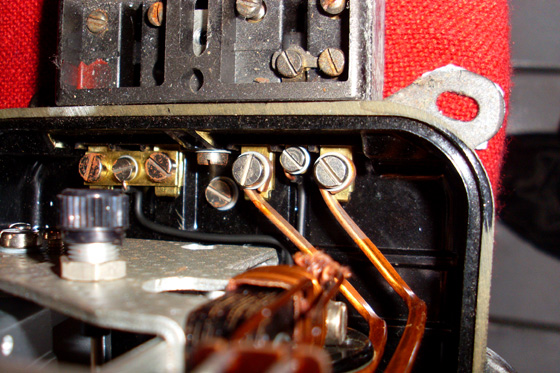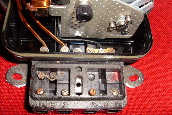 Unten (1-6) ist die Verkabelungs-Szene. Links (bei 1) kommt die Stomzuführung (L) rein (in der Regel schwarz). Rechts (bei 3) kommt die Stromableitung (ebenfalls L) rein (in der Regel schwarz oder braun). Bei 2 ist eine Überbrückung zu 1 (man sieht nach hinten ein schwarzes Kabel heimlich abgehen), diese ist die Stromklauabzweigung für den Motor des Zählers. - Bei 4 kommt die blaue Ader vom Verteiler rein, damit der Motor arbeiten kann. Man sieht nämlich hinten bei 5 eine Überbrückung zu 4 (die ganz hintere Schraube in der Mitte), an der ein weiteres schwarzes Kabel abgeht für den Motor. Bei Motoren & Innererien nehmen (oder nahmen) die Elektriker es offenbar nicht mehr so genau: da gibt’s nur noch schwarze Kabel. Im Übrigen ist für mich unklar, warum überhaupt die Unterteilung 4-5-6 besteht, da üblicherweise lediglich ein einziges blaues N-Kabel (von der Verteilerdose kommend) in 4 reingesteckt wird. Was ja auch wegen der Motorbetreibung völlig ausreichend ist - analog zum Notschalter.