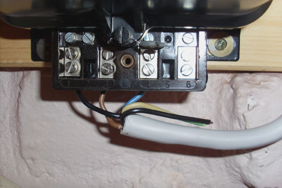 Der Elektriker hat für seine Verdrahtung auch hier wieder - analog wie beim Notschalter - ein 5er Kabel grenommen. Im Gegensatz zum Notschalter hat er jedoch diesmal nicht beide schwarzen Adern benutzt, sondern lediglich nur eine schwarze Ader für die einführende Phase L (in 1) und die braune Ader für die ausführende Phase L (in 3). Blau (N) bleibt nach wie vor blau (in 4).
